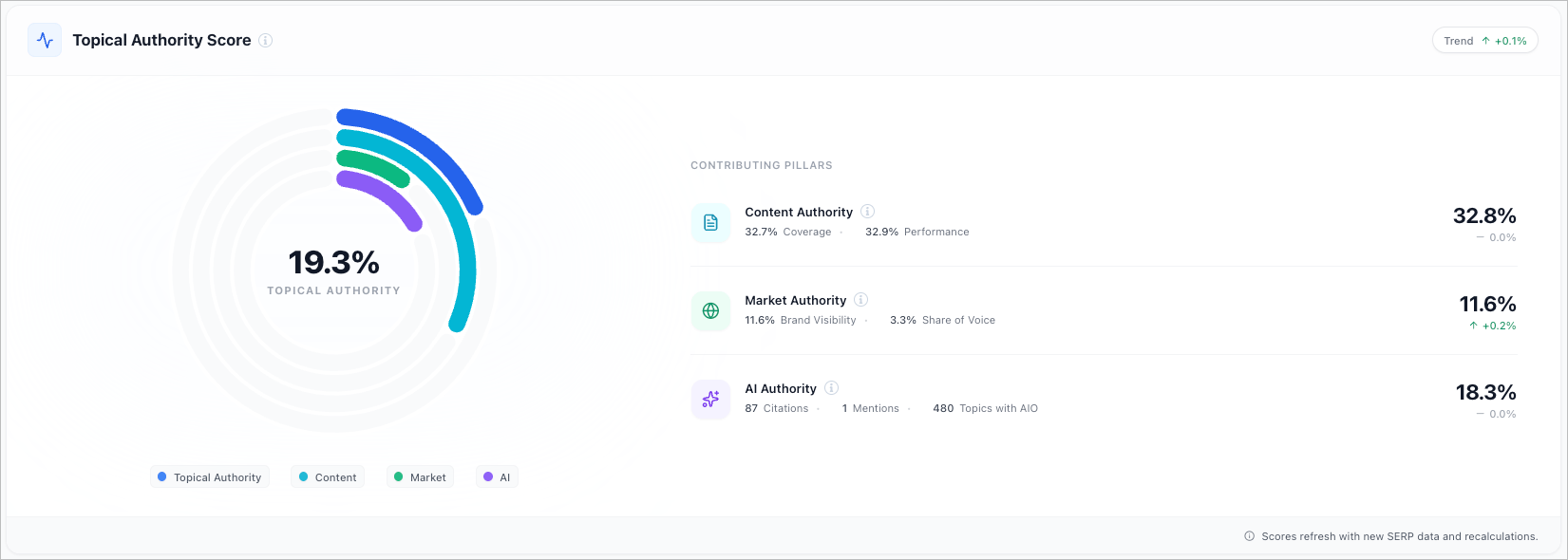 Updated Topical Authority Score with a clearer three-layer stack: Content Authority, Market Authority, and AI Authority